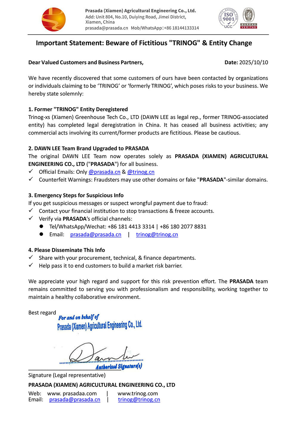 1. Trinog-xs (Xiamen) Greenhouse Tech Co., LTD (DAWN LEE as legal rep) has been legally deregistered in China. It has ceased all business activities; any commercial acts involving its current/former products are fictitious. Please be cautious.